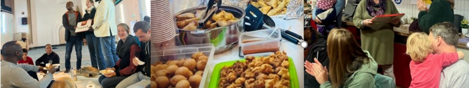 Danach luden die Frauen der Gemeinde zu einem üppigen Buffet mit verschiedenen afrikanischen Köstlichkeiten ein – darunter Samosas, aromatische Eintöpfe und würzige Reisgerichte. In der muslimischen Tradition gilt: Je mehr gegessen wird, desto mehr Segen empfängt der Gastgeber – und so wurde mit Freude, Neugier und Offenheit miteinander gegessen und gesprochen.