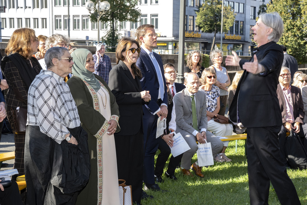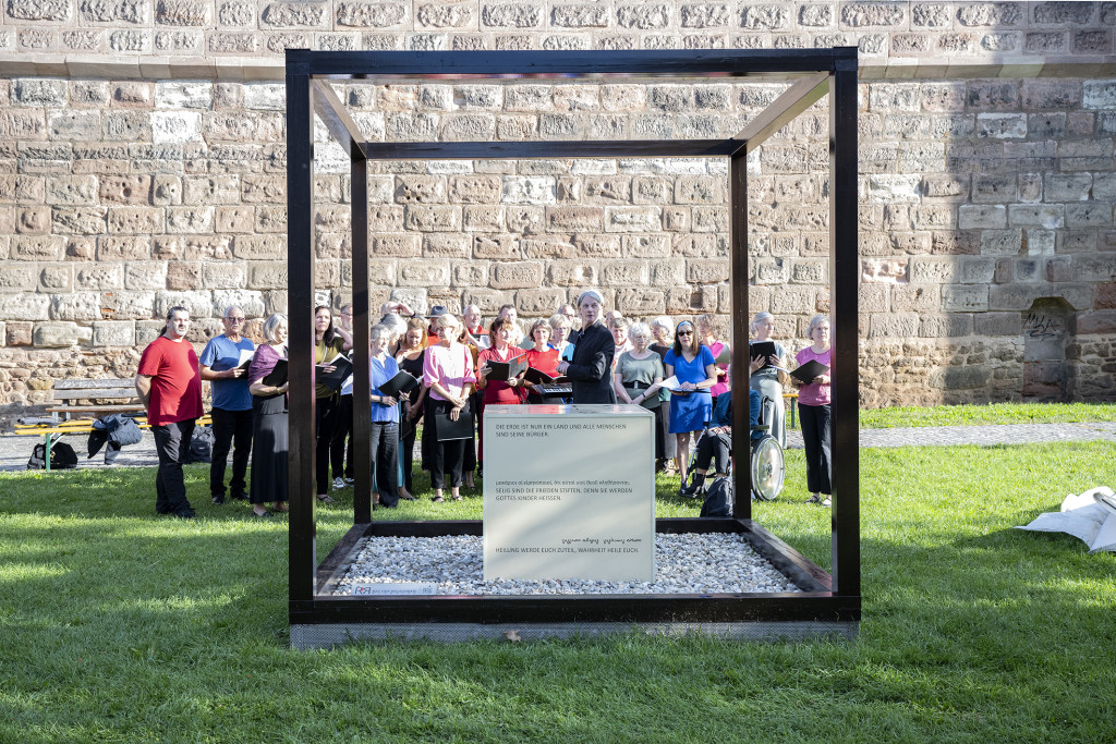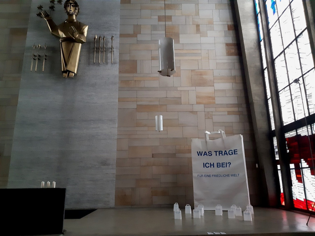 Verleihung des Nürnberger Menschenrechtspreises: beim Friedensgebet am KUBUS der Religionen wird die große Tüte aufgestellt. Auf den Tischen der Friedenstafel stehen viele hundert kleine Tüten und laden zum Nachdenken ein.