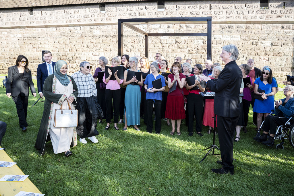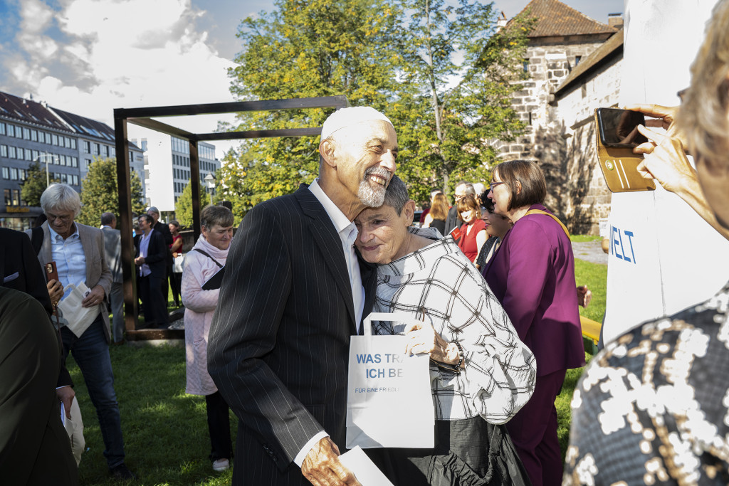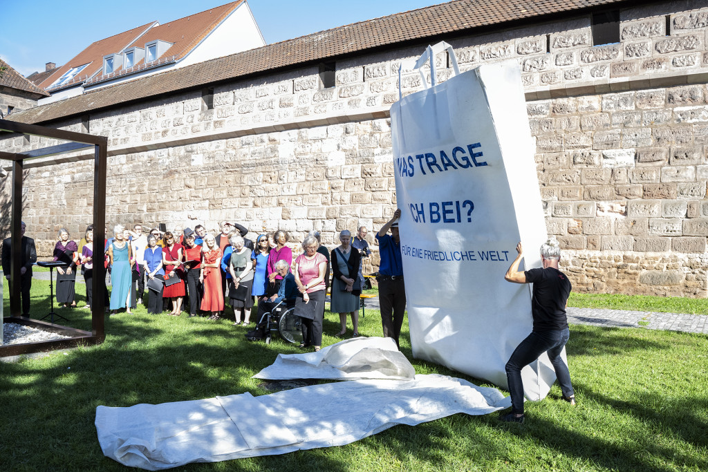 Verleihung des Nürnberger Menschenrechtspreises: beim Friedensgebet am KUBUS der Religionen wird die große Tüte aufgestellt. Auf den Tischen der Friedenstafel stehen viele hundert kleine Tüten und laden zum Nachdenken ein.